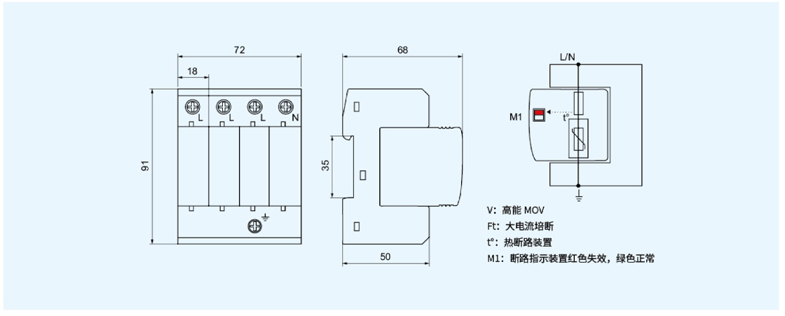 SPD内置脱离器。当SPD因过热、击穿失效时,脱离器能自动的将其电网上脱离,同时给出指示信号。SPD正常工作时可视窗口显示绿色,失效脱离后显示红色。